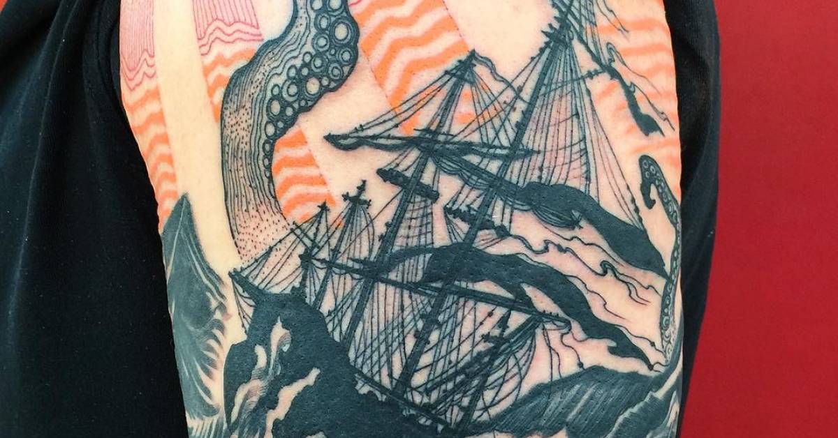 23. Illustrative Style Sailing Ship And Kraken Tattoo On